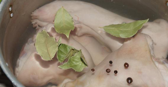 - Doe de varkenspoten in een grote pan, giet het water erbij, doe het laurierblad en de peperkorrels. Zet de pan op het vuur.