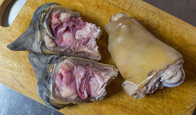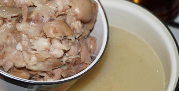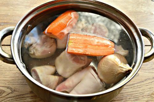 - Giet in aparte containers de lamskop en hoeven met water, voeg de ui toe, zet op hoog vuur en breng aan de kook. Verwijder daarna het schuim en kook het slachtafval op laag vuur tot het gaar is. Kook in een aparte kom de rundertong samen met de uien.