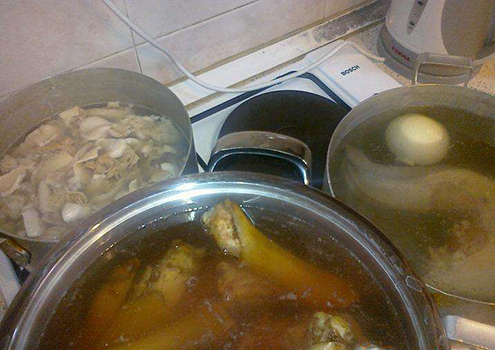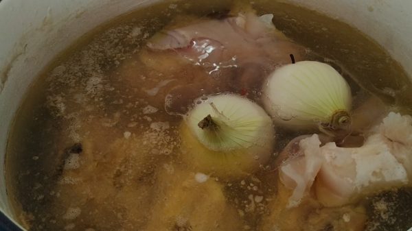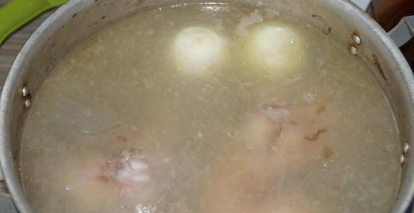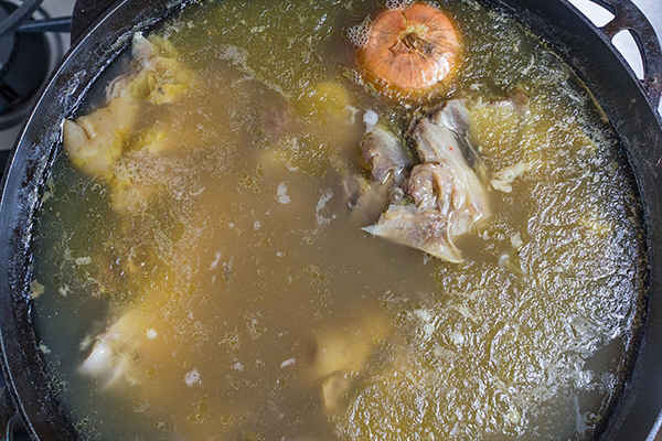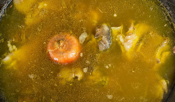 - Wanneer het water kookt, zet het vuur laag en kook gedurende 6 uur, regelmatig afromen. Voeg na 3 uur de gepelde uien toe.