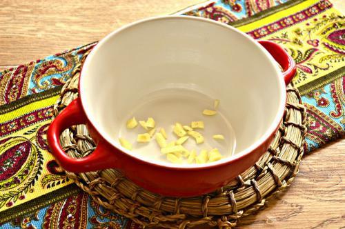 - Giet khash met stukjes varkensvlees in een kom knoflook.
