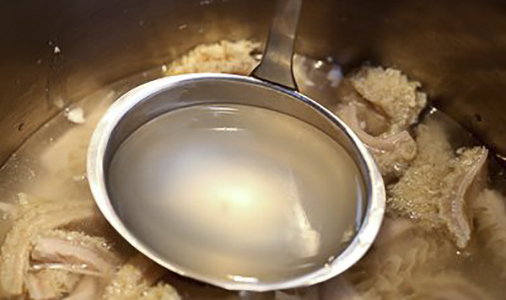- Haal het varkensvlees uit de bouillon en scheid het vlees van de botten.