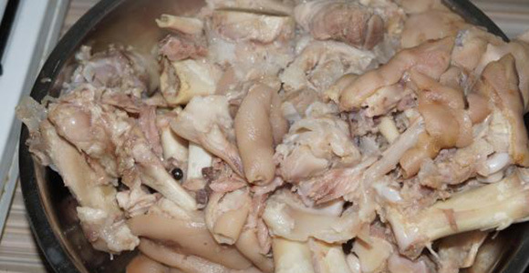 - Als de runderpoten gaar zijn, haalt u ze uit de ketel, laat ze afkoelen en scheidt u het vlees van de botten.