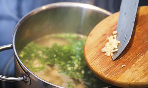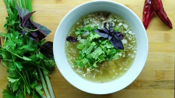 - Hak de knoflook en kruiden fijn met een mes, doe ze in een pan met hasj. Breng de soep aan de kook en serveer.
