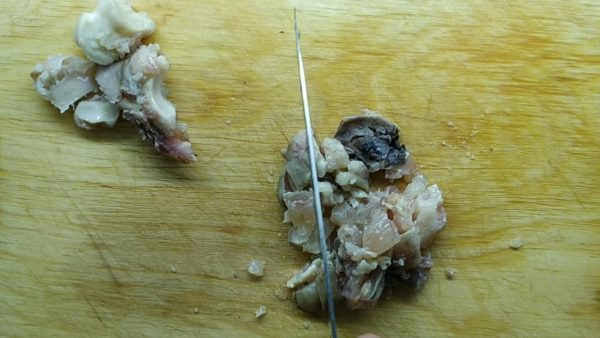 - Snijd de maag in kleine stukjes, bedek met water en zet op hoog vuur, breng aan de kook. Giet daarna het water af, was de maag opnieuw, vul hem met schoon water en laat hem opnieuw koken tot hij gaar is.