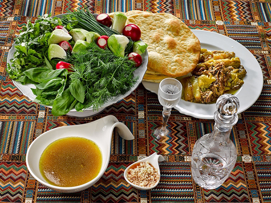 - Hak de kruiden en knoflook fijn. Schik de knoflook en kruiden in de borden, giet de khash erbij en serveer. Zout de soep ieder naar zijn eigen smaak.