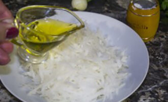 Schil de radijs, rasp en breng op smaak met plantaardige olie.