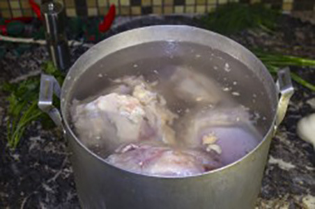 - Was de varkenspoten, schil ze, snijd ze in kleine stukjes, bedek ze met water en laat ze een nacht staan.