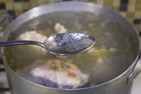 Breng de bouillon aan de kook, zet het vuur laag en laat 8 uur sudderen, regelmatig afschuimen.