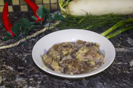 - Giet in aparte containers de lamskop en hoeven met water, voeg de ui toe, zet op hoog vuur en breng aan de kook. Verwijder daarna het schuim en kook het slachtafval op laag vuur tot het gaar is. Kook in een aparte kom de rundertong samen met de uien.