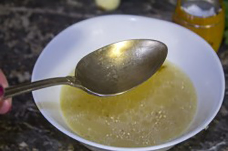 Pel de knoflook en passeer door een pers. Vul het met 300-400 milliliter bouillon, voeg azijn en zout toe. Dit wordt een dressing voor khash.