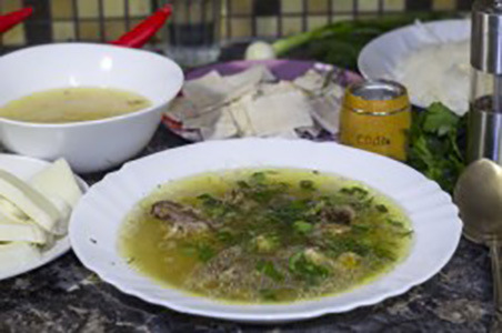 - Hak de kruiden en knoflook fijn. Schik de knoflook en kruiden in de borden, giet de khash erbij en serveer. Zout de soep ieder naar zijn eigen smaak.