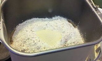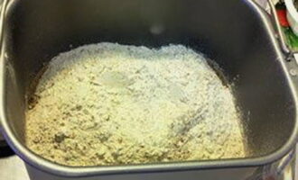 Giet plantaardige olie in een emmer van een broodmachine, vet de messen licht in om het deeg ermee te mengen. Voeg ook melk en gezeefd tarwe- en roggemeel toe.
