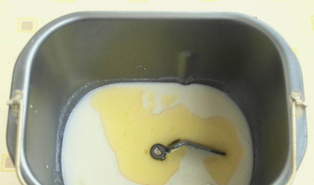 - Giet warm water, melk en plantaardige olie in een emmer van een broodmachine.