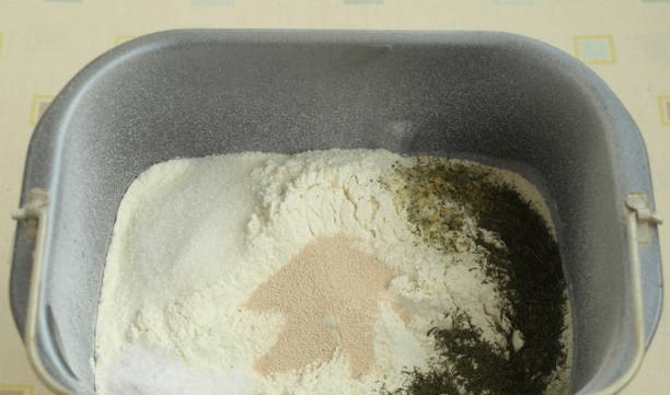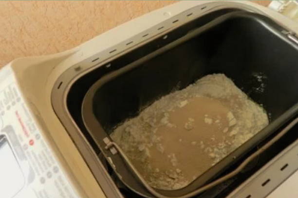 - Giet warm water, melk en plantaardige olie in een emmer van een broodmachine. Voeg vervolgens zout, suiker, bloem en droge gist toe.