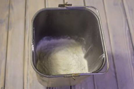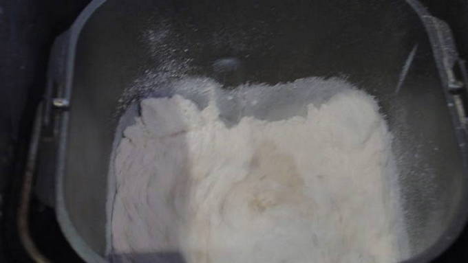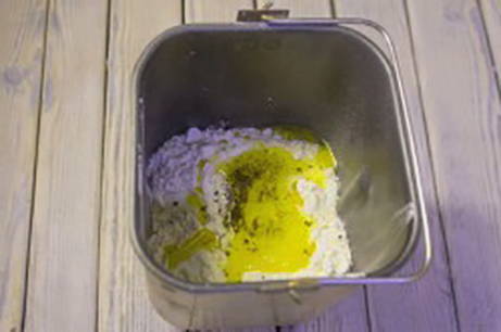 - Giet de droge ingrediënten in de emmer van de broodmachine en zet de modus "Hoofdbrood" aan.Wanneer het kneden begint, giet je langzaam het vloeibare mengsel en de plantaardige olie erin.