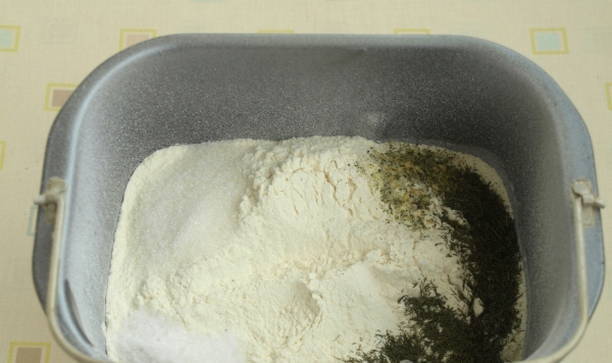 - Zeef bloem direct in een emmer, voeg zout, suiker, droge dille en knoflookkruiden toe.