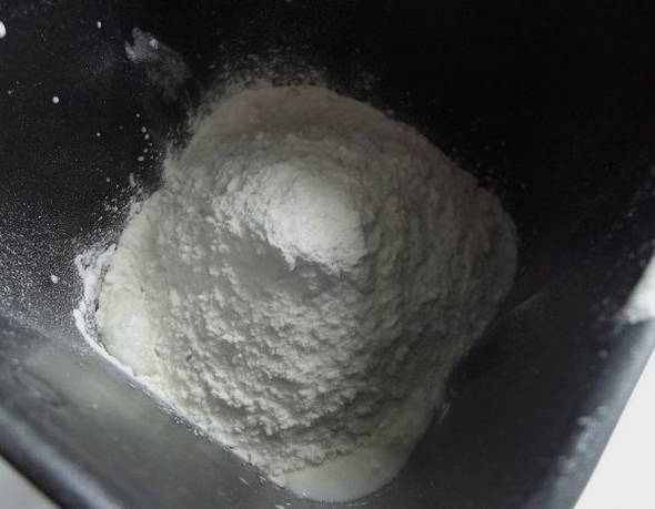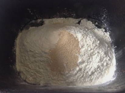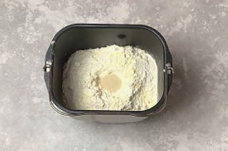 - Plaats de deegpeddels in de kom van de broodbakmachine. Giet er water op kamertemperatuur en plantaardige olie in. Voeg vervolgens melkpoeder, zout, suiker en gezeefde bloem toe.