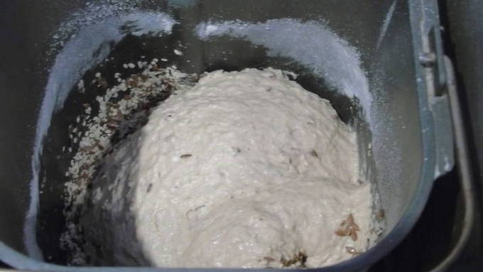 - Voeg sesamzaad toe. Je kunt dit additief naar eigen smaak toevoegen. Plaats de emmer in de broodbakmachine, selecteer het programma voor brood van 750 gram. Bestuif het deeg na het kneden met bloem tot het knapperig is.