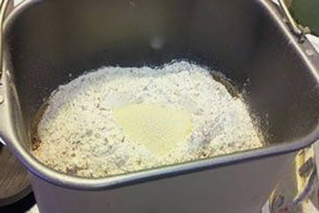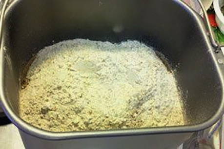 - Giet de droge ingrediënten in de emmer van de broodmachine en zet de modus "Hoofdbrood" aan.Wanneer het kneden begint, giet je langzaam het vloeibare mengsel en de plantaardige olie erin.
