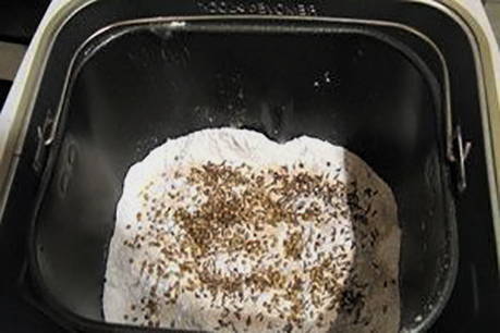 - Nu kunt u overgaan tot het plaatsen van de ingrediënten in de broodbakmachine. Doe in een emmer een glas rogge- en tarwebloem, karwijzaad, melasse, zout en giet er warme thee bij, voeg ook een glas zuurdesem toe. Activeer in het broodmachinemenu het programma Basis Brood en wacht op het geluidssignaal dat het brood klaar is.