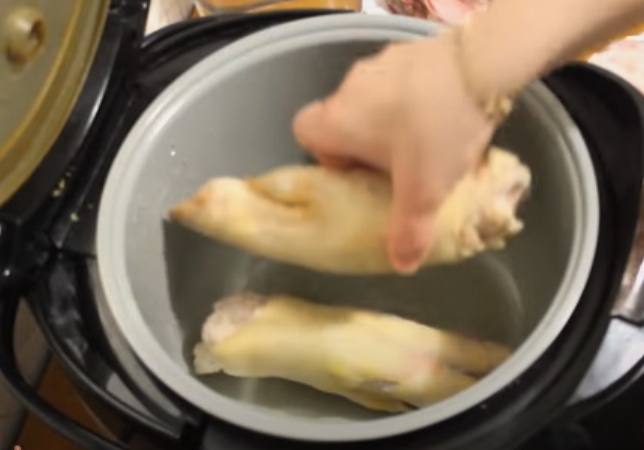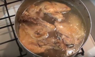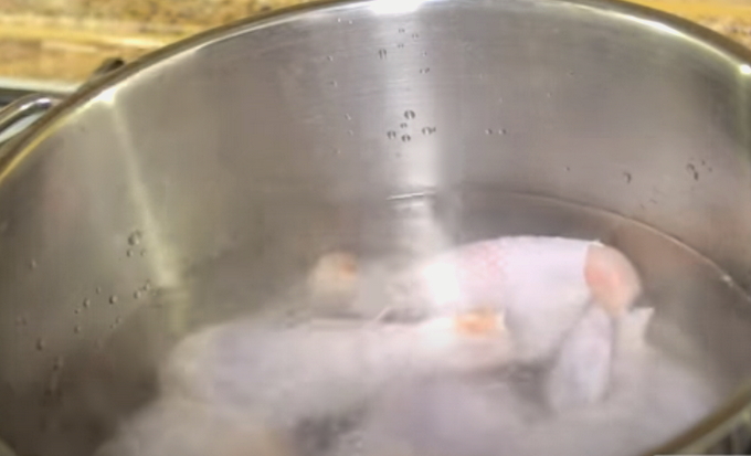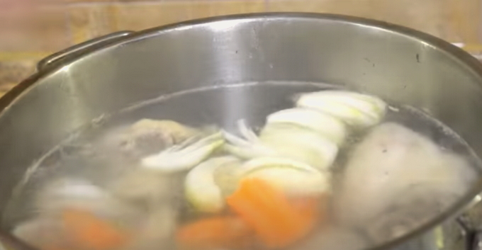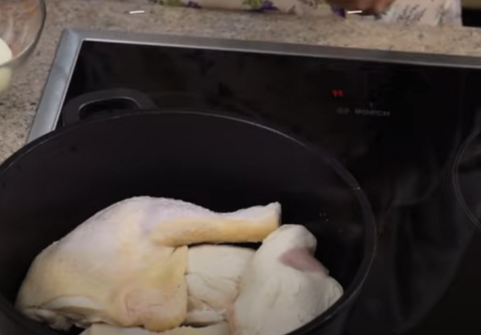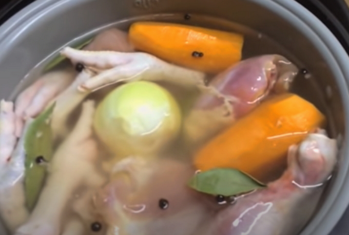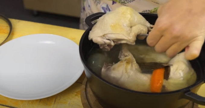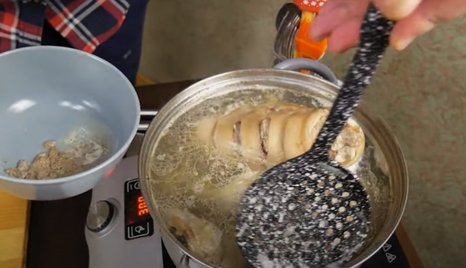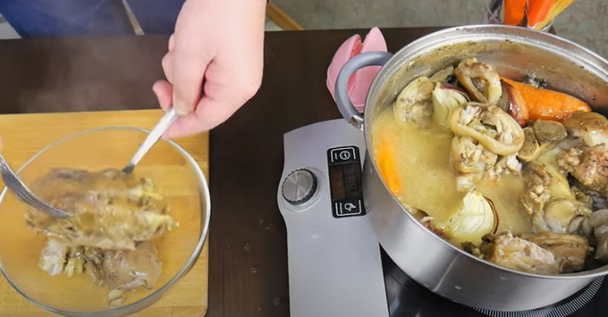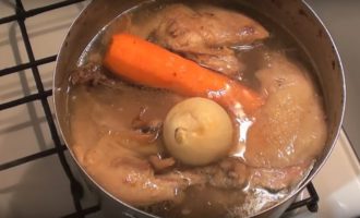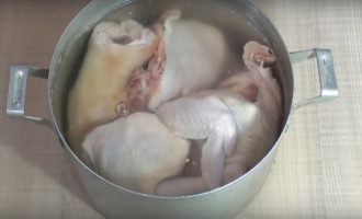 - Spoel de kip af en voeg toe aan de pan aan de varkenskop als er ongeveer 4 uur zijn verstreken vanaf het begin van het koken. Ook moet je op dit moment laurierblaadjes en peperkorrels aan de bouillon toevoegen.