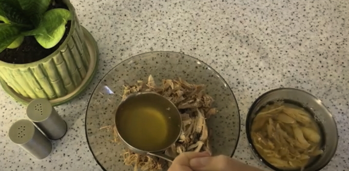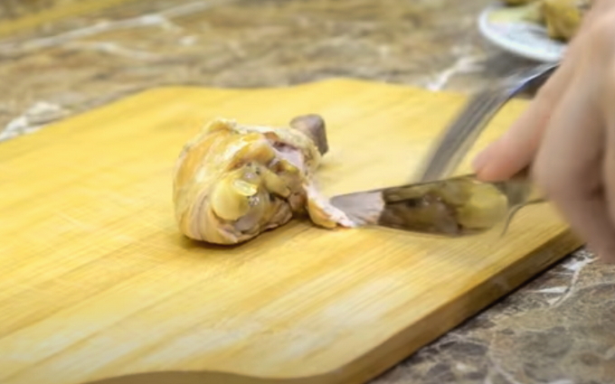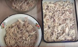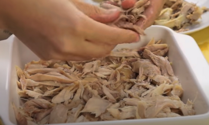 - Als alle ingrediënten klaar zijn, haal je de pan van het vuur en haal je de kip voorzichtig uit de bouillon om jezelf niet te verbranden. Nadat het is afgekoeld, scheidt u het vlees van de botten en snijdt u het in kleine blokjes.