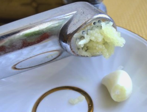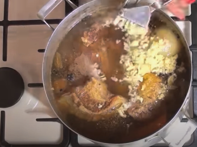 - Terwijl het vlees kookt, schil je de knoflook en haal je deze door een pers. De knoflook moet ongeveer 5-10 minuten voor het einde van het koken aan de bouillon worden toegevoegd.