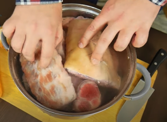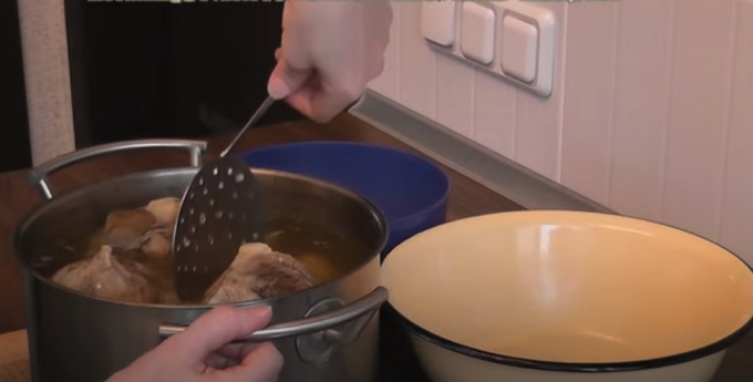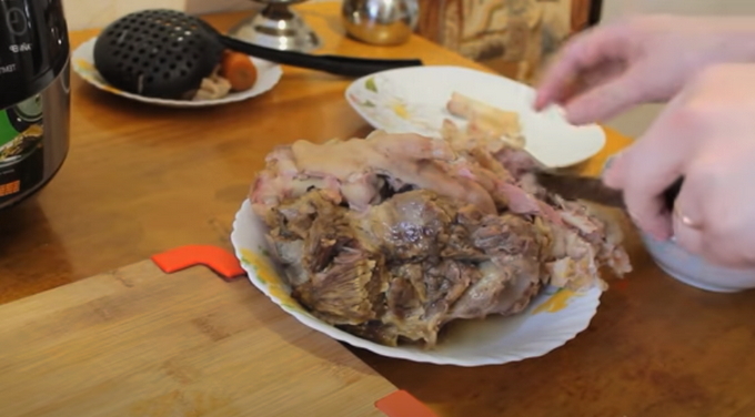 - Zet het vuur uit en verwijder heel voorzichtig de vlees- en varkenspoten uit de kokende bouillon. Om het vlees van de botten te scheiden, moeten ze worden afgekoeld tot een aangename temperatuur wanneer het vlees pijnloos kan worden gehanteerd.