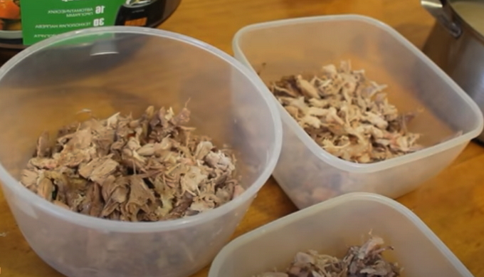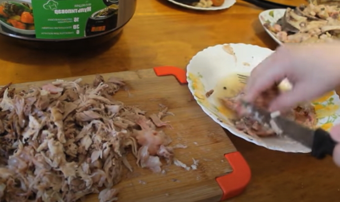 - Wanneer de multicooker klaar is met het programma en piept, verwijdert u het vlees voorzichtig op een groot bord en wacht u tot het is afgekoeld tot een temperatuur waarop het kan worden gehanteerd. Scheid het vlees van de botten en snijd het in kleine stukjes, of beter, demonteer het met de hand tot vezels.
