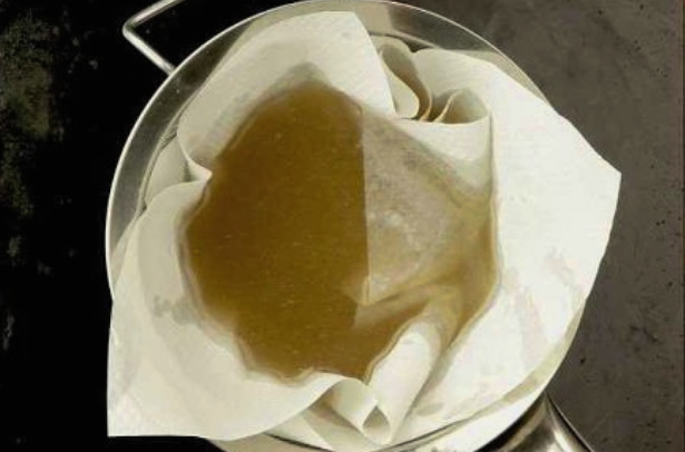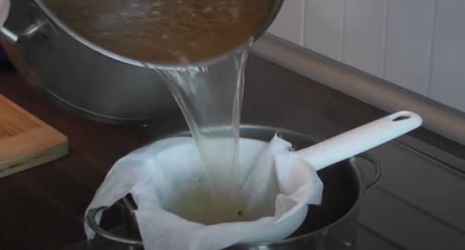 - Zeef de bouillon eerst door een zeef en vervolgens door kaasdoek dat in meerdere lagen is gevouwen.