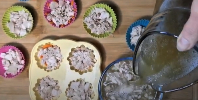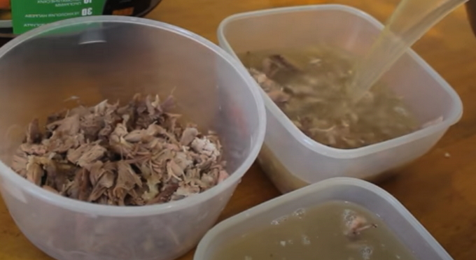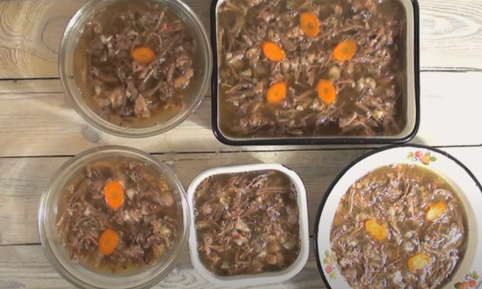 - Leg de stukken vlees in de vormen, vul ze met schone bouillon en zet ze 6-8 uur in de koelkast (vergeet niet de vormen af te dekken met deksels of huishoudfolie).