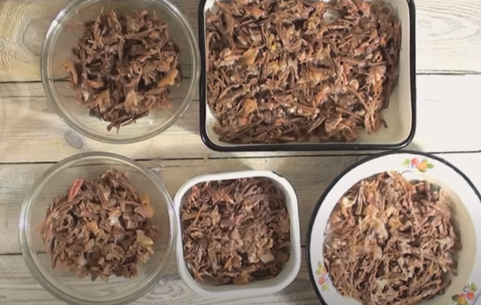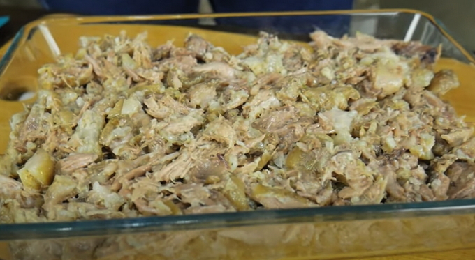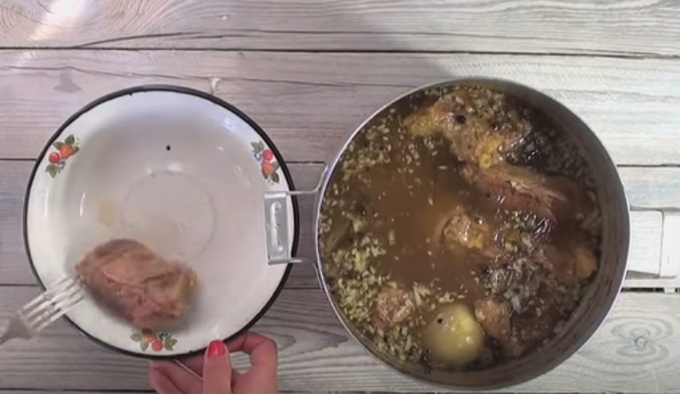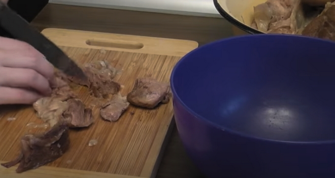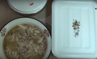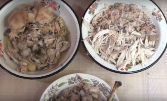 - Zet na 6 uur het vuur uit en verwijder voorzichtig het varkensvlees en de kip. Als het vlees is afgekoeld, scheidt u het voorzichtig van de botten (u moet ook het vel, de hersenen en de vetste delen van het varkensvlees verwijderen). Het vlees moet fijn genoeg worden gesneden.