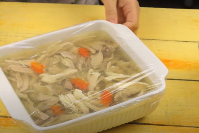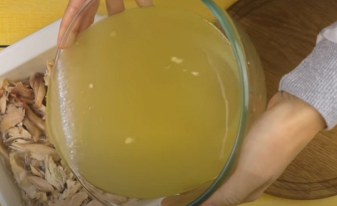 - Breng de gesneden kip over naar een omrande schaal en giet er vervolgens de bouillon in (als u besluit wortels te gebruiken, moet deze in dit stadium met bouillon aan het vlees worden toegevoegd). Bedek de vorm met huishoudfolie en zet hem 4-6 uur in de koelkast tot hij volledig is uitgehard.