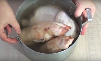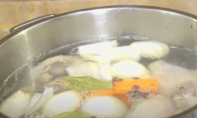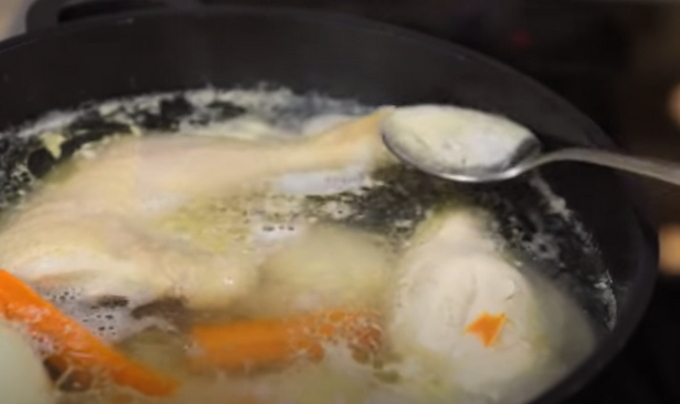 - De kip moet onder stromend water worden afgespoeld en in een kleine pan worden geplaatst (voor het gemak kunt u het karkas in verschillende delen snijden). Giet 1 liter water over het vlees en zet de pan op het vuur. Als het water kookt, giet je het af en spoel je de kip af. Giet vervolgens opnieuw 1 liter water en breng het water in een pan aan de kook. Vergeet niet om tijdens het kookproces het schuim te verwijderen, zodat de bouillon schoon en transparant is. Nadat het water kookt, voeg je de hoeveelheid zout toe die je nodig hebt en zet je het vuur een beetje lager. Laat de kip ongeveer 20 minuten op matig vuur sudderen.