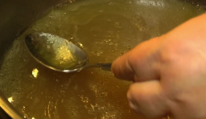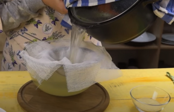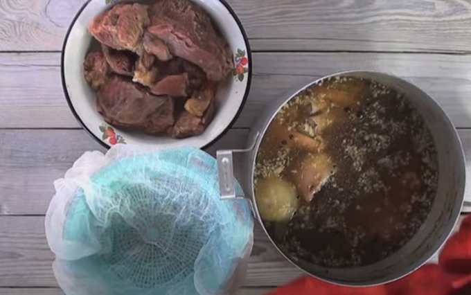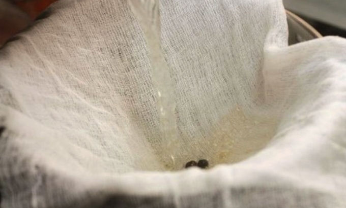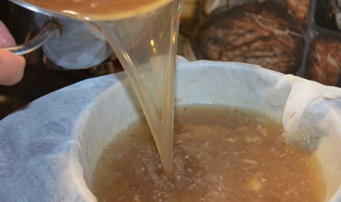 - De bouillon moet worden gefilterd door een zeef met gaas dat in meerdere lagen is gevouwen.