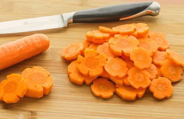 - Schil de wortelen, spoel ze af en kook ze in een kleine pan gaar. Giet het water af en laat de gekookte wortelen afkoelen. Snijd de wortel in kleine cirkels. Indien gewenst kun je er verschillende figuren uit knippen.