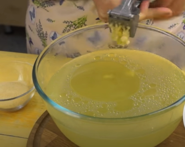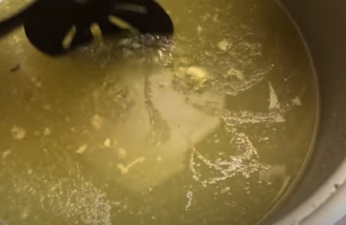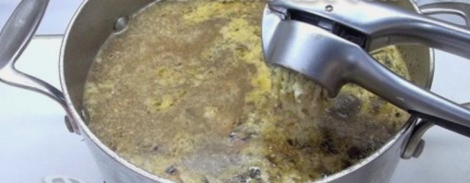 - Pel de knoflook en passeer door een pers direct in de kokende bouillon. Dit moet letterlijk een paar minuten voor het einde van het koken worden gedaan, zodat de bouillon een heldere smaak en aroma krijgt.
