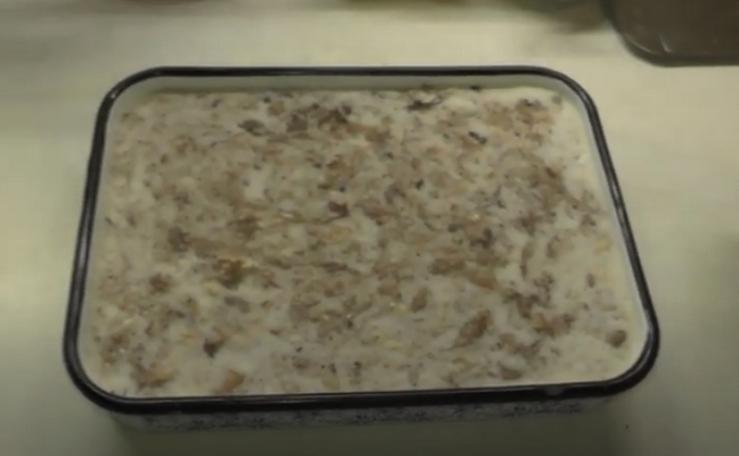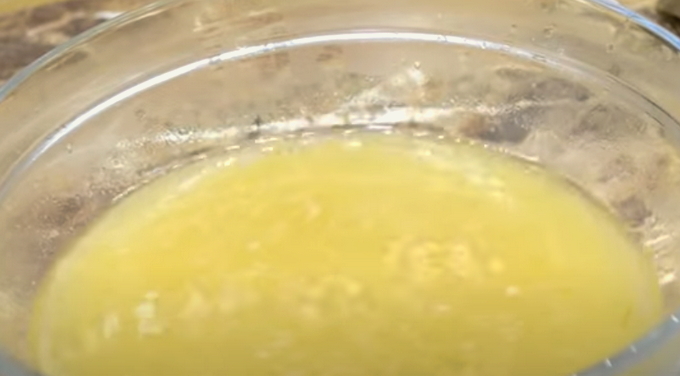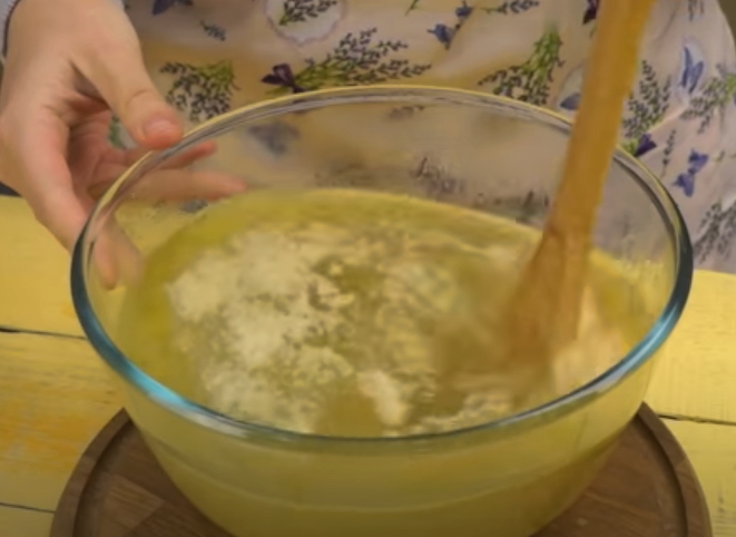 - Koel de bouillon en zeef door kaasdoek dat in meerdere lagen is gevouwen. Giet 50 ml afgekoelde bouillon in een mok en voeg er een eetlepel instantgelatine aan toe. Roer en laat 5-10 minuten staan (gedurende deze tijd heeft de gelatine de tijd om op te zwellen).