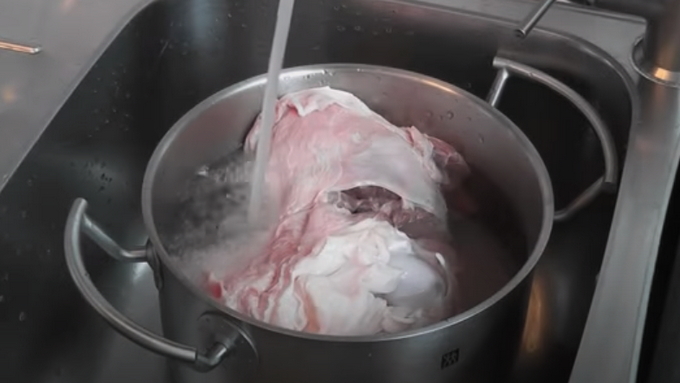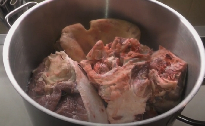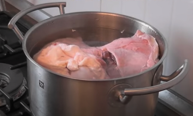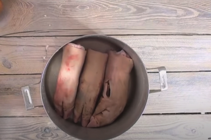 - Was je hoofd grondig (je kunt er zelfs met een borstel overheen wrijven), als er ergens haren achterblijven, verwijder deze dan met een aansteker. De oren moeten worden afgesneden en het hoofd zelf moet in een grote pan worden geplaatst en met koud water worden afgedekt. Laat het varkensvlees in deze vorm 10 uur staan.