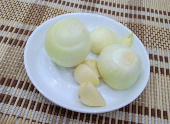 - Uien en knoflook moeten worden afgepeld en vervolgens onder koud water worden afgespoeld.