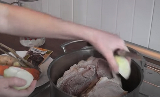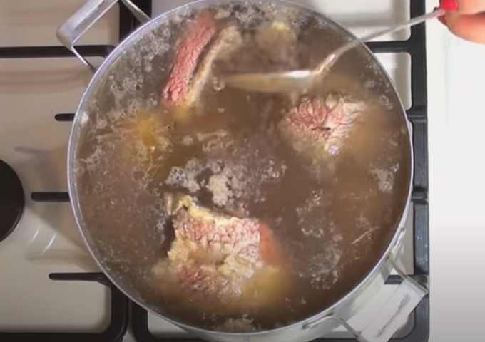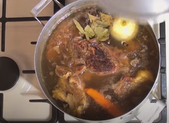 Tijdens het koken vormt zich schuim op het oppervlak van het water, verwijder het met een schuimspaan of zeef, anders krijgt u geen transparantie van de bouillon. Als het water goed kookt, giet u de eerste bouillon af, spoelt u de pan en het vlees, vult u opnieuw met water en zet u het op het fornuis. Als het water weer kookt, voeg je de hoeveelheid zout toe die je nodig hebt, dek je de pan af met een kleine opening en zet je het vuur lager. De bouillon mag niet te veel koken en uit de pan stromen, er mag slechts een lichte periodieke borrel zijn. Laat het vlees ongeveer 3 uur sudderen.