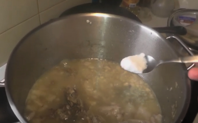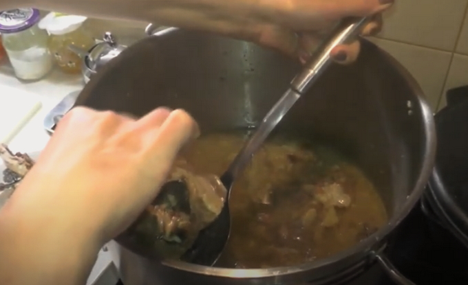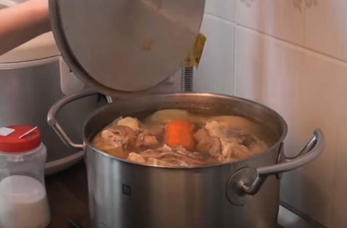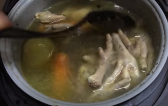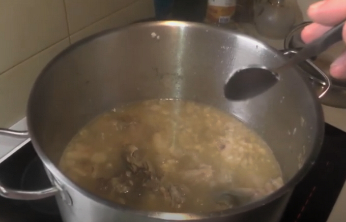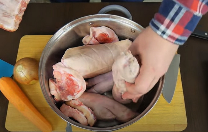 - Zet de pan op hoog vuur en wacht tot de inhoud van de pan kookt. Al het schuim dat zich op het wateroppervlak vormt, verwijder voorzichtig met een schuimspaan. Nadat het water kookt, zet je het vuur lager en breng je op smaak met bouillon. Ga door met het sudderen van de poten en schenk ze ongeveer 6,5 uur op laag vuur.