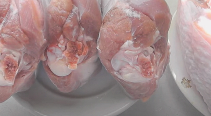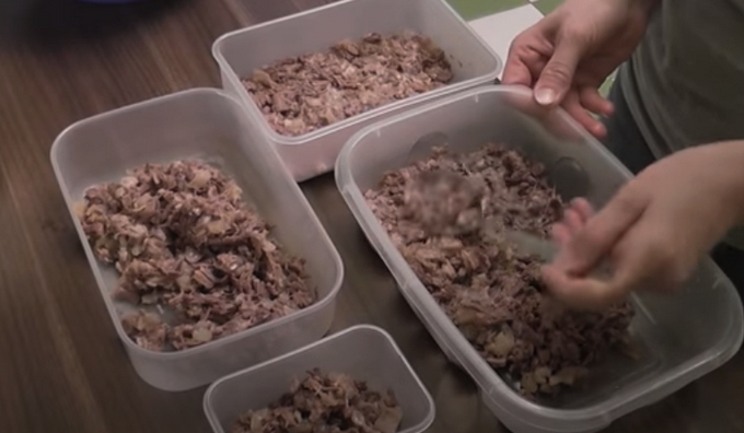 - Het is de beurt aan het snijden van vlees. Verwijder alle stukjes vlees van de botten en vezels of snijd ze met een scherp mes.