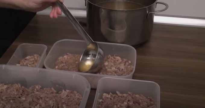 Nu moet je het gehakte vlees in containers schikken waarin het gelei-vlees zal bevriezen. Giet de bouillon over het vlees en dek de vormen af. Als je geen deksels hebt, maakt het niet uit, vershoudfolie zal ze perfect vervangen. Zet de vormen met kant-en-klaar geleivlees enkele uren in de koelkast.