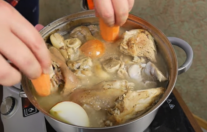 - Zet het vuur bijna laag, dek de pan af en laat de kip 3 uur sudderen. Schil terwijl het vlees kookt de helft van de wortelen en de schil van de helft van de uien. Spoel de groenten af en voeg ze na 3 uur toe aan de pan met de kip. Stuur gepelde teentjes knoflook en een paar snufjes zout erheen. Kook groenten tot ze gaar zijn (ongeveer 30-40 minuten).