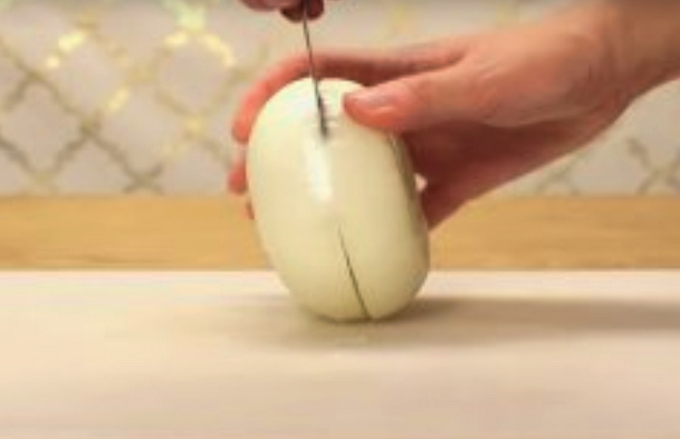 - Pel de ui en knoflook. Snijd de kop van de ui in 2 delen.
