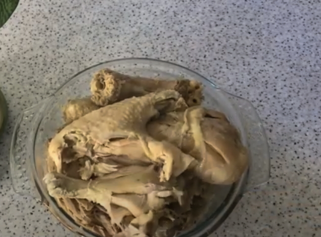 - Als het vlees lang genoeg heeft gekookt, zet u het vuur uit en verwijdert u het vlees op een bord. Nadat het is afgekoeld tot een warme staat, scheidt u het vlees van de botten (we hebben de huid, botten en vet niet meer nodig).