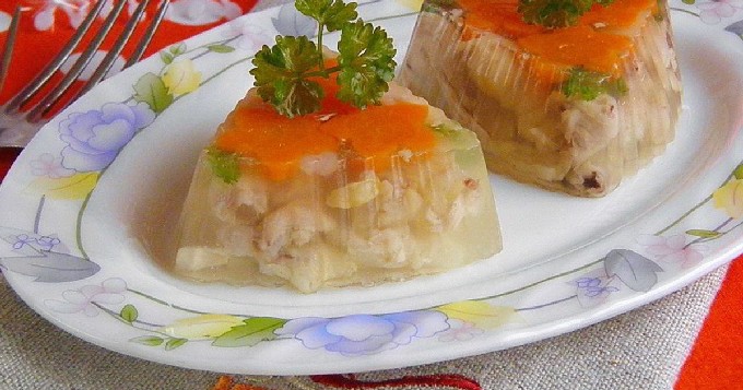 Een heel eenvoudig, maar tegelijkertijd erg lekker gerecht. Geleivlees van kip kan zowel voor een vakantie als alleen voor het avondeten worden bereid. Dit voorgerecht zal zowel volwassenen als zelfs kinderen aanspreken. Probeer zeker ook eens gelei te maken volgens ons recept.