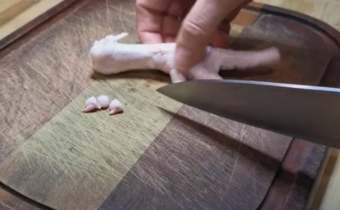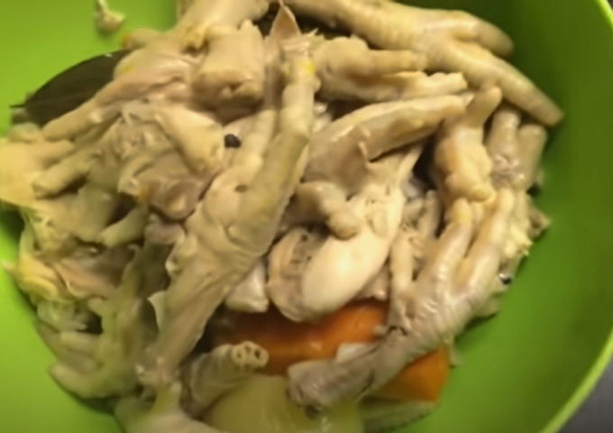 - Voordat u gelei-vlees van kippenpoten gaat koken, moet u deze zelfde poten wassen en 10 minuten kokend water gieten, dit is nodig zodat de huid op de poten gestoomd is en gemakkelijk kan worden afgepeld. Nadat de benen goed zijn gestoomd, maakt u ze schoon (verwijder de huid en knip de plaats af waar de nagel op de vingers zat).