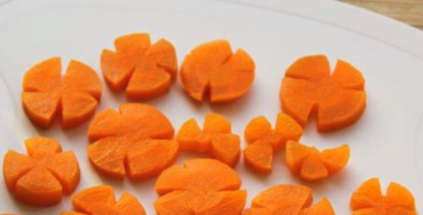 - De afgekoelde wortelen moeten zorgvuldig worden geschild en in cirkels worden gesneden, en vervolgens met een mes de cirkels verschillende vormen geven: hart, bloem, sterren, enz. (we zullen wortelen gebruiken voor decoratie).